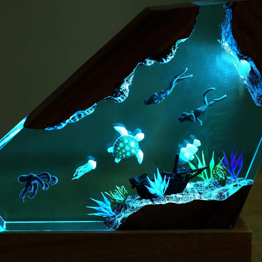Ocean Creative Epoxy Resin Wood Light Lamp, Handmade Aquatic Ocean Lamp Deep Sea Diver Cave Diving Enthusiasts Led Night Light